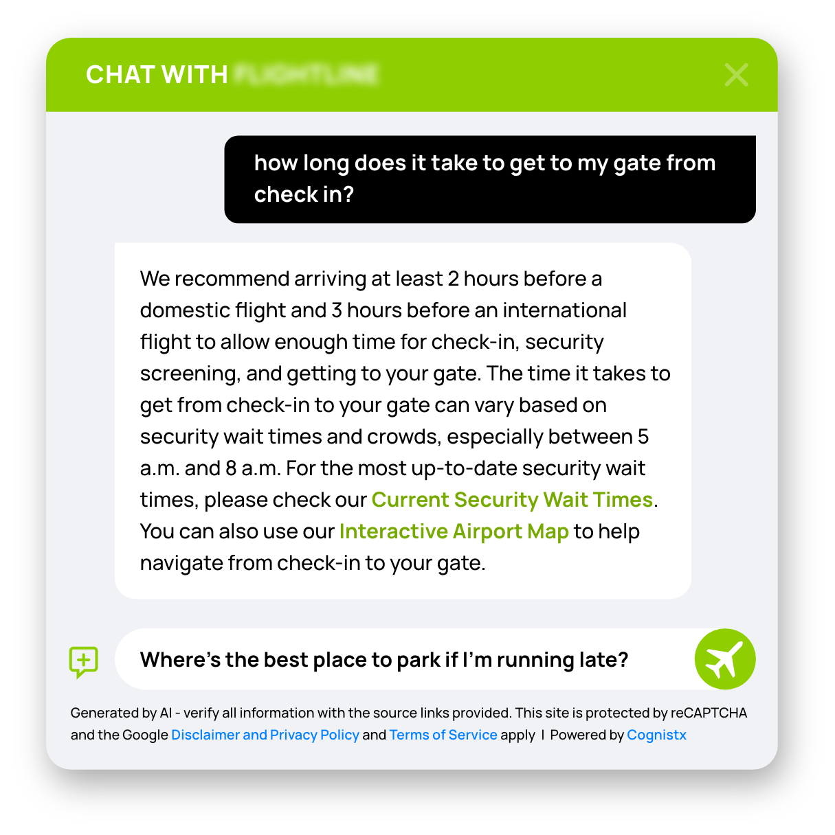Cognistx launched SQUARY Chat on the official airport website to assist flyers with questions about gates, parking, baggage, lounges, and more. Map navigation features and multi-language support were implemented to allow all travelers to locate terminals, shops, and services directly through chat. Dashboard controls were enabled for internal administrators to refine and improve the system over time. SQUARY Chat was integrated into the website with zero engineering lift — completed in a few hours.